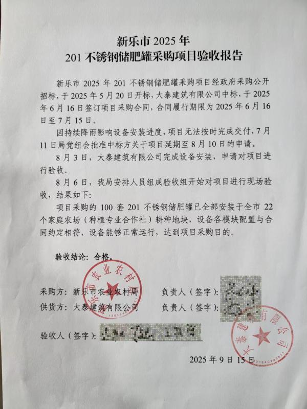 新乐市2025年201不锈钢储肥罐采购项目经政府采购公开招标,于2025年5月20日开标,大泰建筑有限公司中标,目前该项目已完成并被验收。为体现公开、公平、公正原则,现将项目验收报告及合同款拨付情况予以公示,接受社会监督。