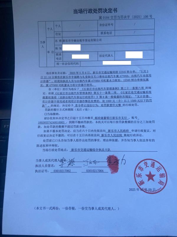 出租汽车冀A7Y9X0不使用计价器行政处罚