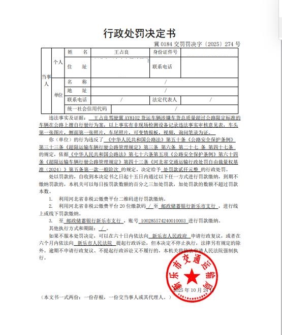 王占良驾驶冀AY8102货运车辆涉嫌车货总质量超过公路限定标准的车辆在公路上擅自行驶行为案