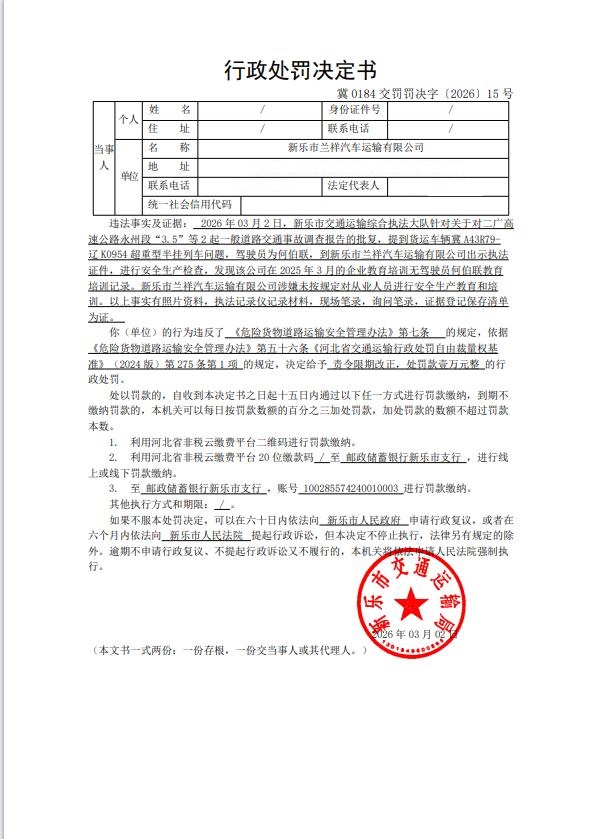 新乐市兰祥汽车运输有限公司涉嫌未按照规定对从业人员进行安全教育和培训案