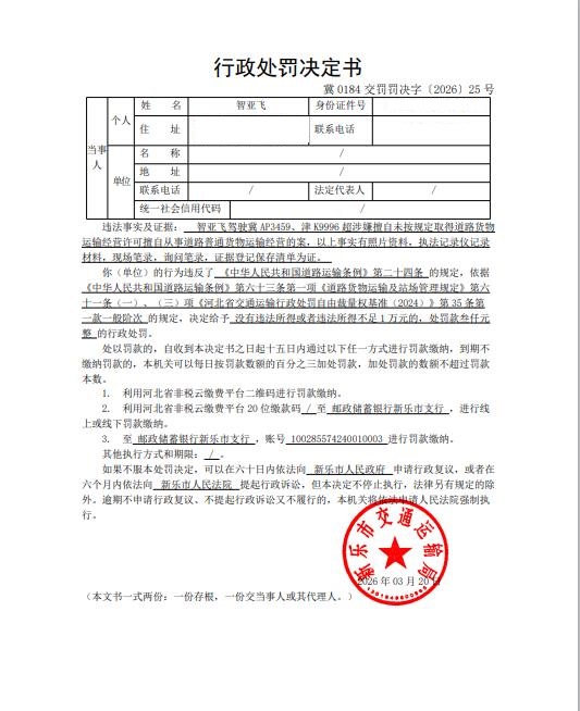 智亚飞驾驶冀AP3459 津K9996超涉嫌未按规定取得道路运输经营许可证擅自从事道路普通货物运输经营的人案
