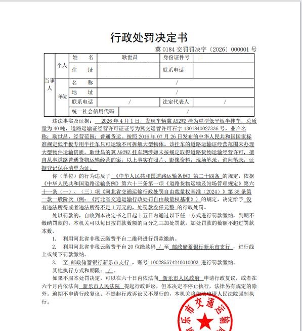 耿世昌的冀A92WZ挂车辆涉嫌未按规定取得道路货物运输经营许可,擅自从事道路普通货物运输经营的案
