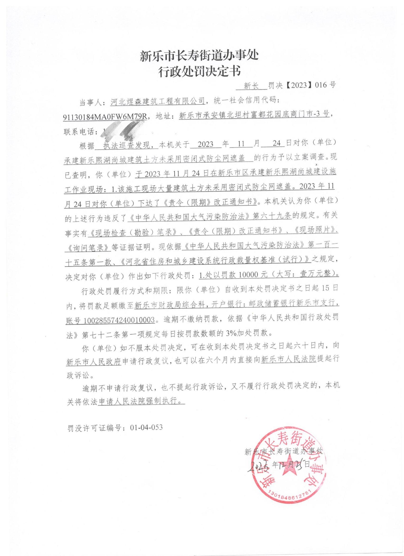 河北煜森建筑工程有限公司承建新乐熙湖尚城建筑土方未采用密闭式防尘网遮盖案