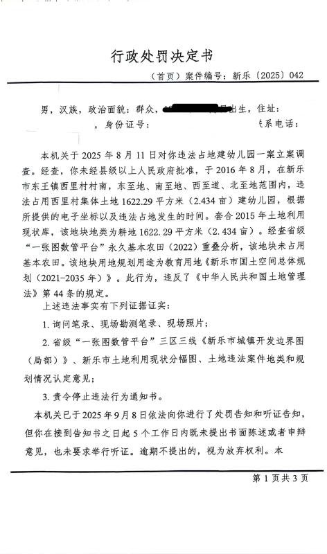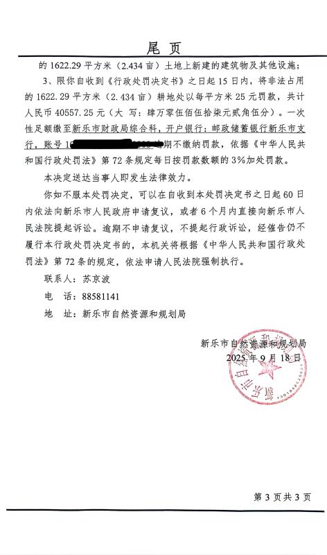 新乐市自然资源和规划局行政处罚决定书(新乐[2025]042)