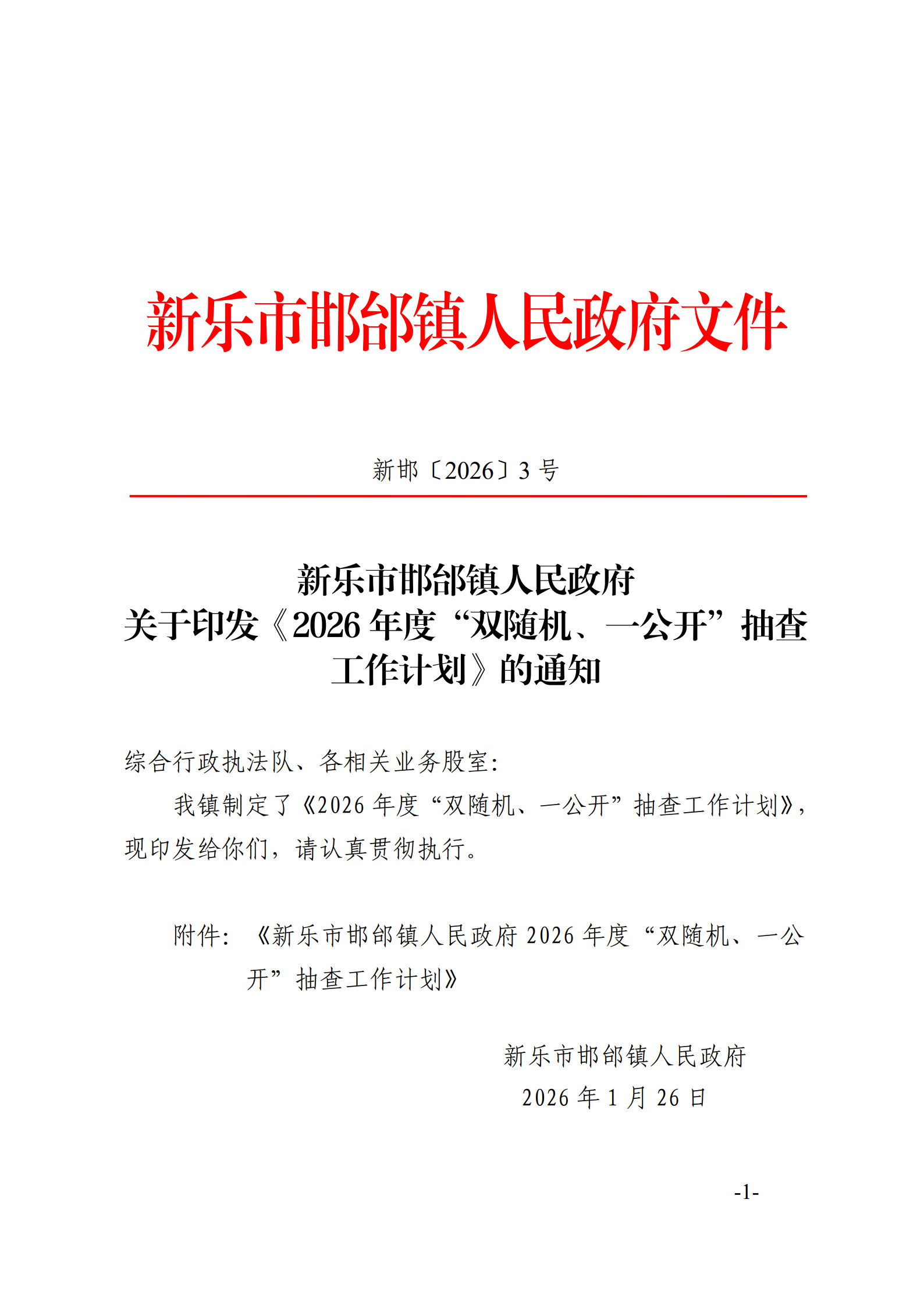 关于印发《2026年度“双随机、一公开”抽查工作计划》的通知