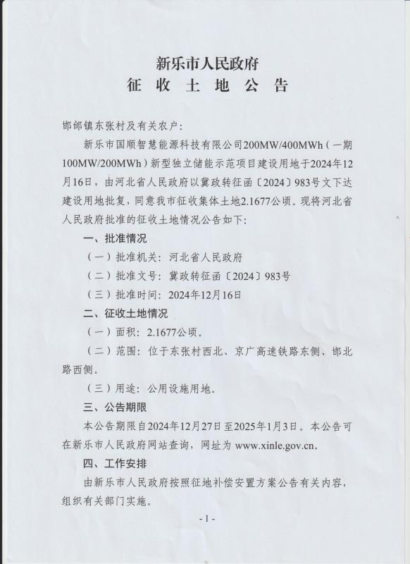 新乐市国顺智慧能源科技有限公司200MW/400MWh(一期100MW/200MWh)新型独立储能示范项目建设用地征收土地公告