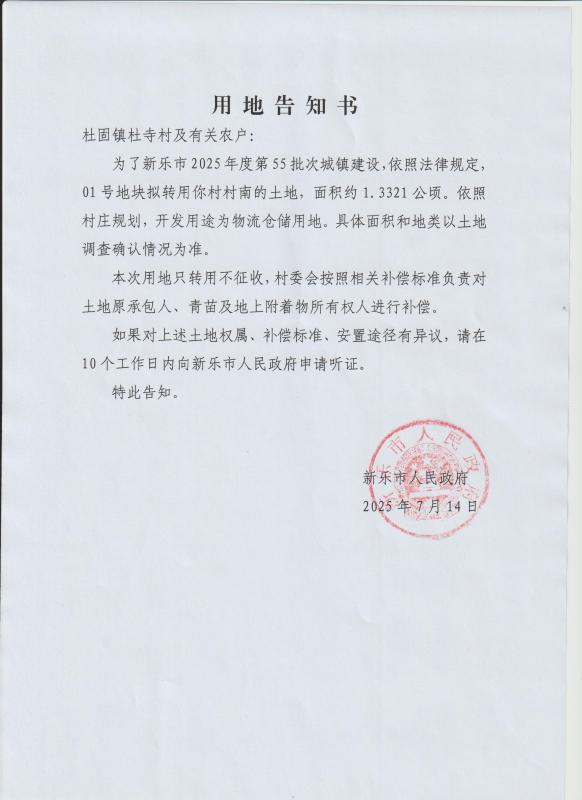 新乐市2025年度第55批次城镇建设用地告知书