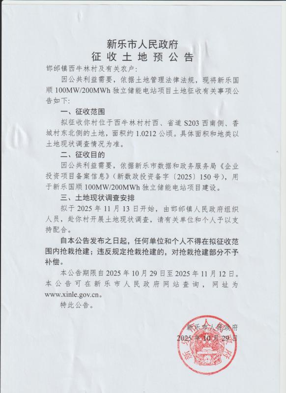 新乐市人民政府征收土地预公告(新乐市国顺100MW/200MWh独立储能电站项目)