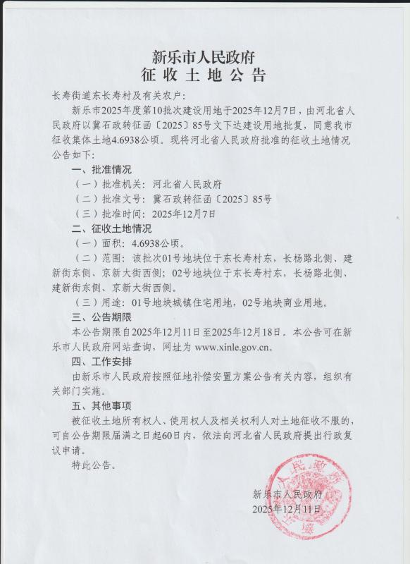 新乐市2025年度第10批次建设用地征收土地公告