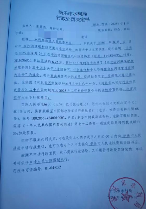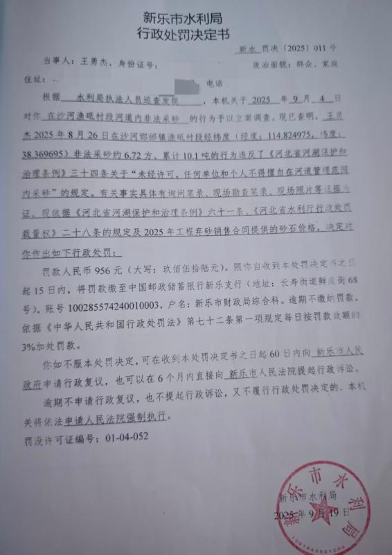 新乐市水利局行政处罚信息公开新水罚决(2025)011号