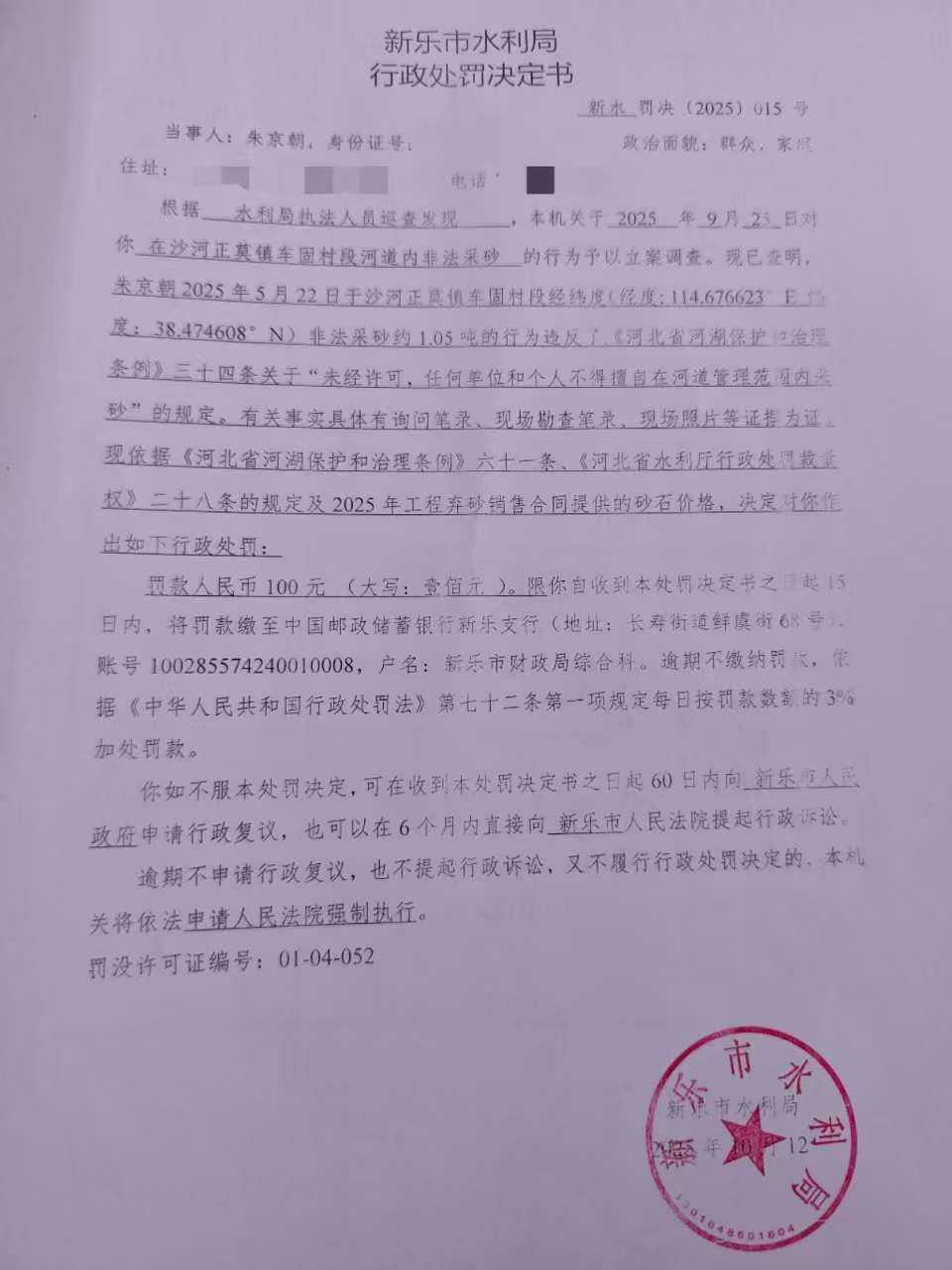新乐市水利局行政处罚信息公开新水罚决(2025)015号