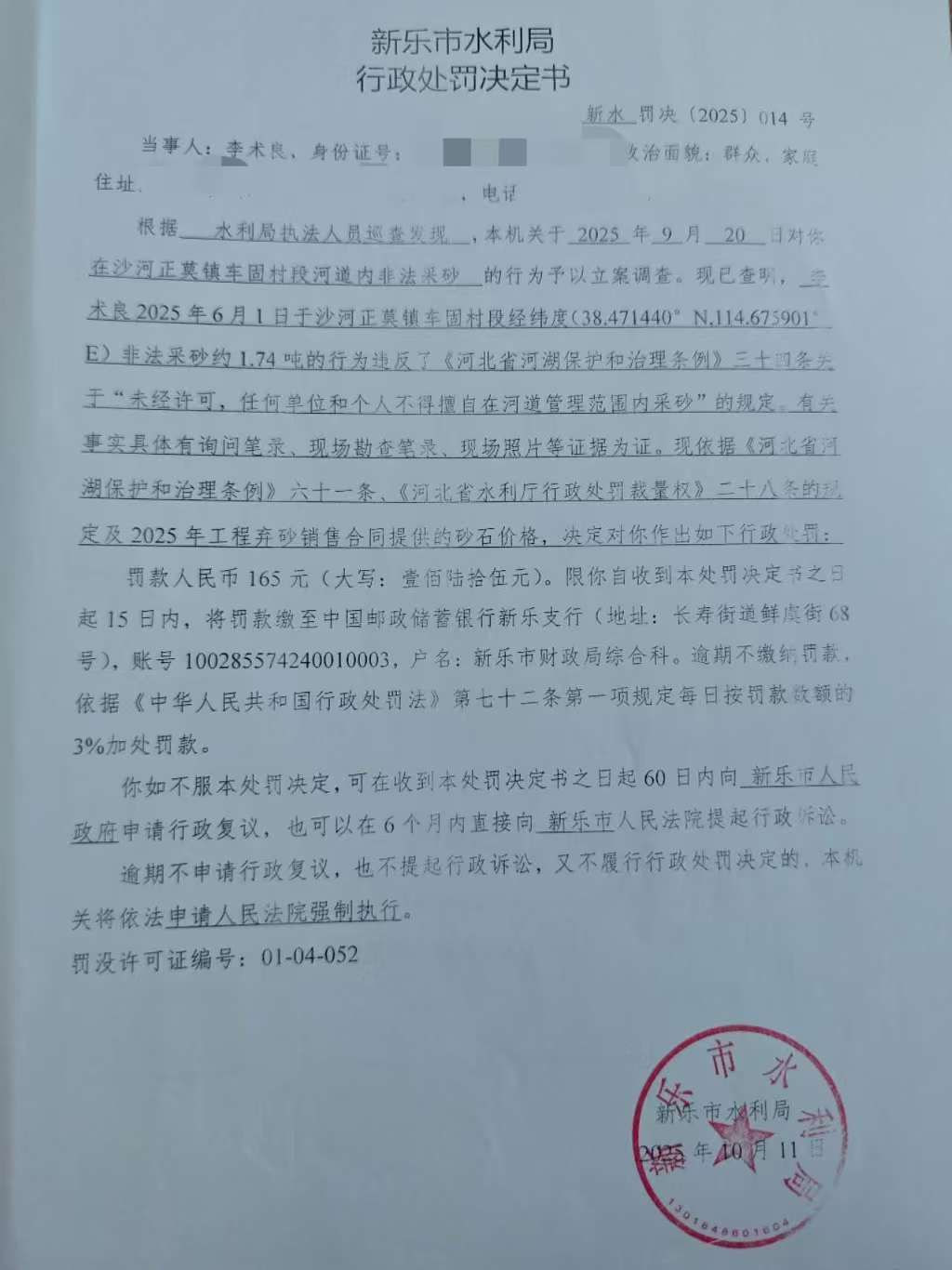 新乐市水利局行政处罚信息公开新水罚决(2025)014号