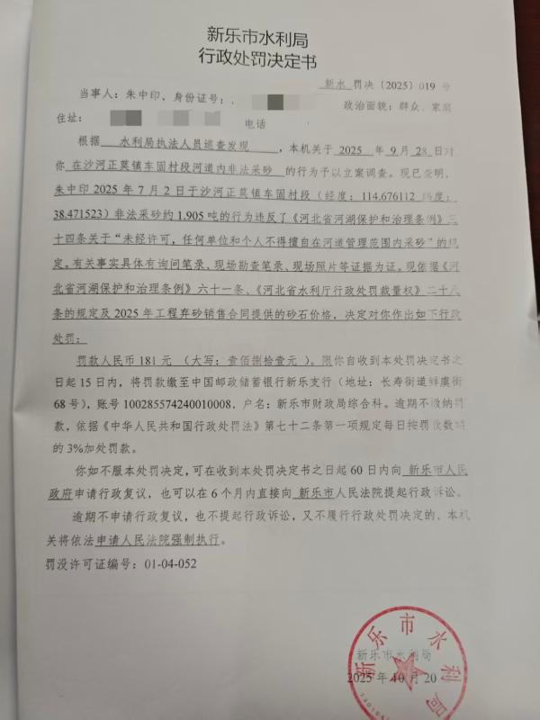 新乐市水利局行政处罚信息公开新水罚决(2025)019号