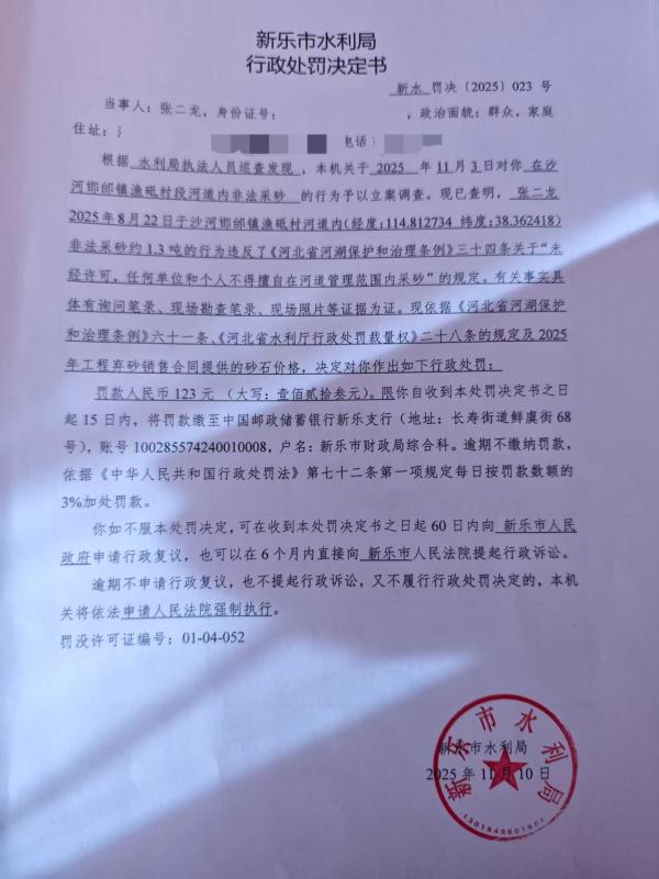 新乐市水利局行政处罚信息公开新水罚决(2025)023号