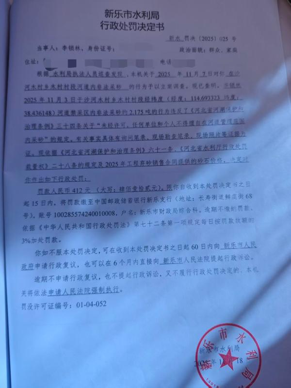 新乐市水利局行政处罚信息公开新水罚决(2025)025号