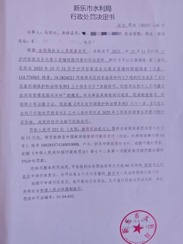 新乐市水利局行政处罚信息公开新水罚决(2025)026号