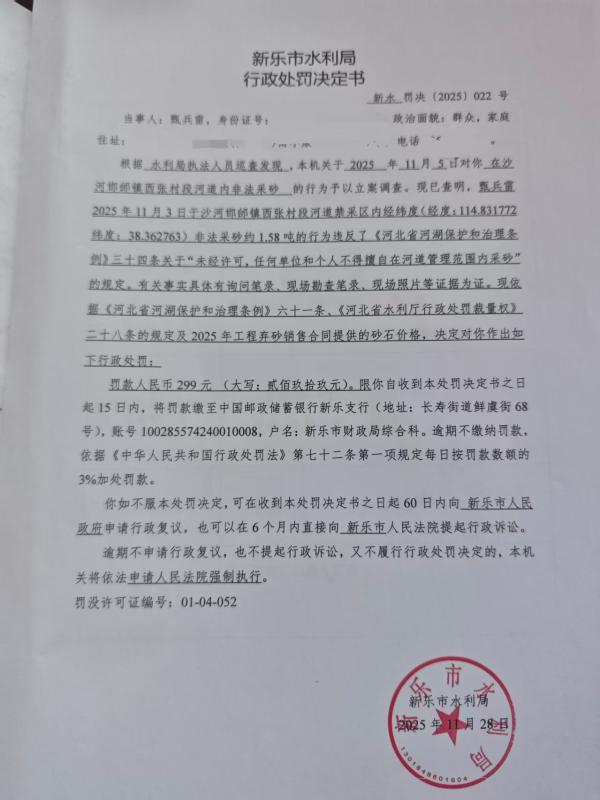 新乐市水利局行政处罚信息公开新水罚决(2025)022号