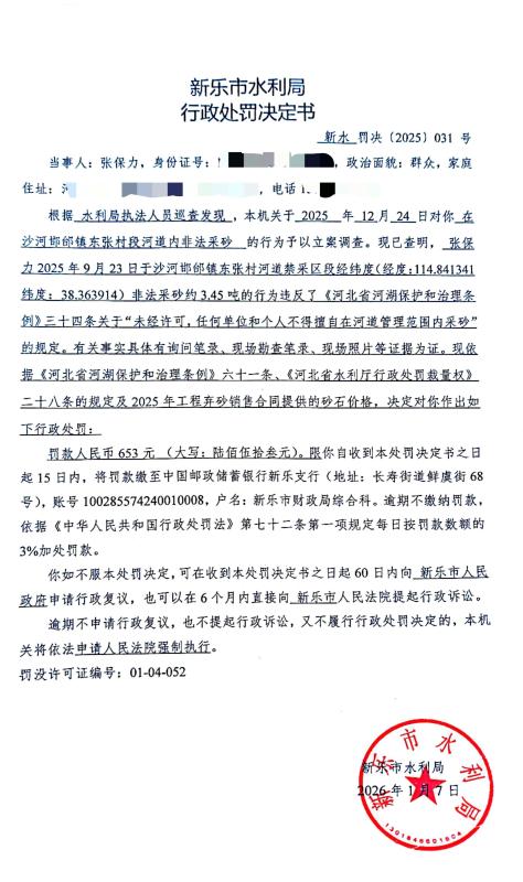 新水罚决【2025】031号张保力非法采砂行政处罚公示
