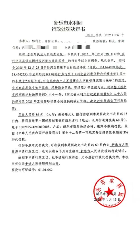 新水罚决【2025】032号郭利全非法采砂行政处罚公示