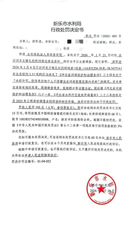 新水罚决【2026】003号郝军虎非法采砂行政处罚公示