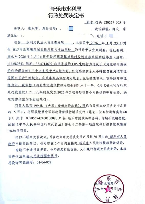 新水罚决【2026】005号康永军非法采砂行政处罚公示