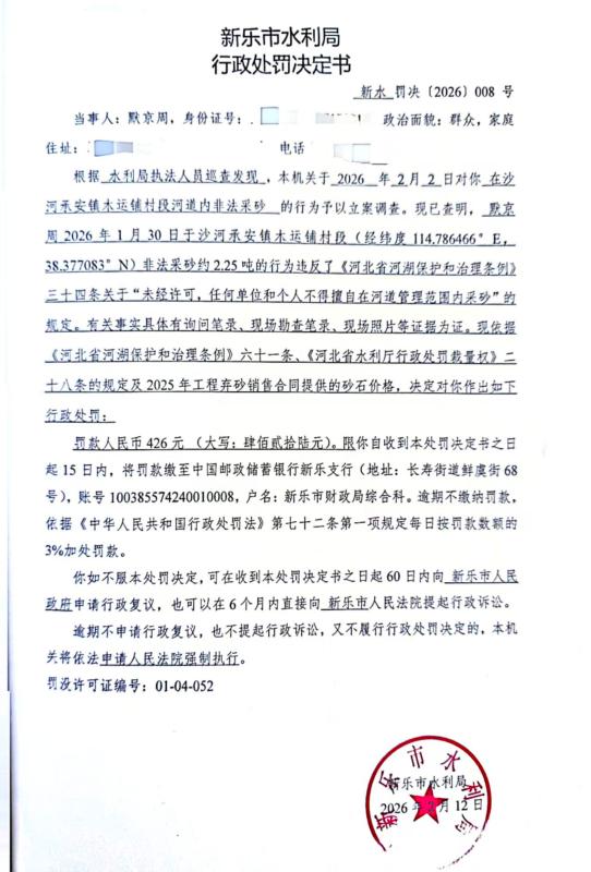 新水罚决【2026】008号默京周非法采砂行政处罚公示