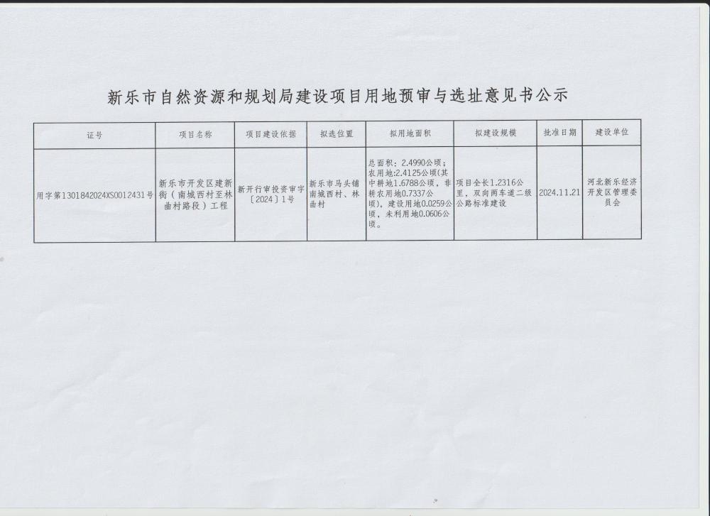 新乐市自然资源和规划局建设项目用地预审与选址意见书公示(新乐市开发区建新街(南城西村至林曲村路段)工程)