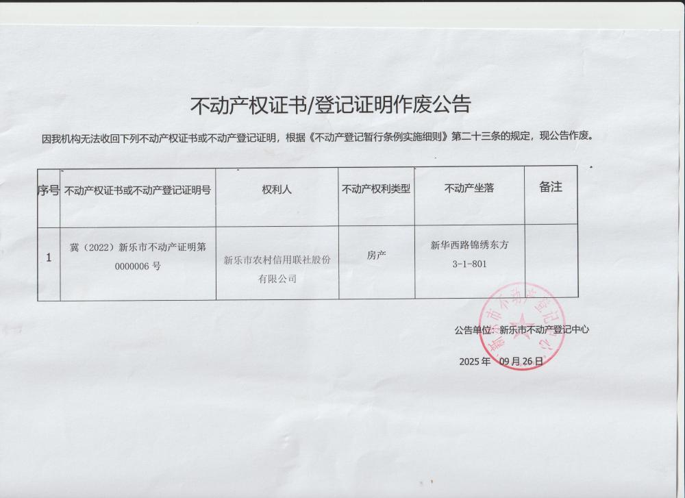 不动产权证书/登记证明作废公告(20220000006)