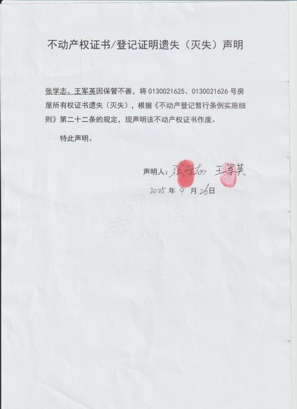 不动产权证书/登记证明遗失声明(0130021625、0130021626)