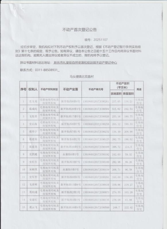 不动产首次登记公告(北双晶村16宗)