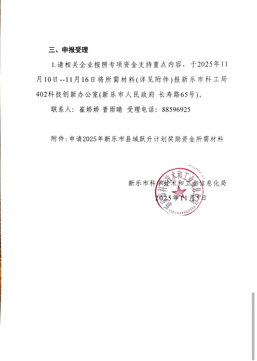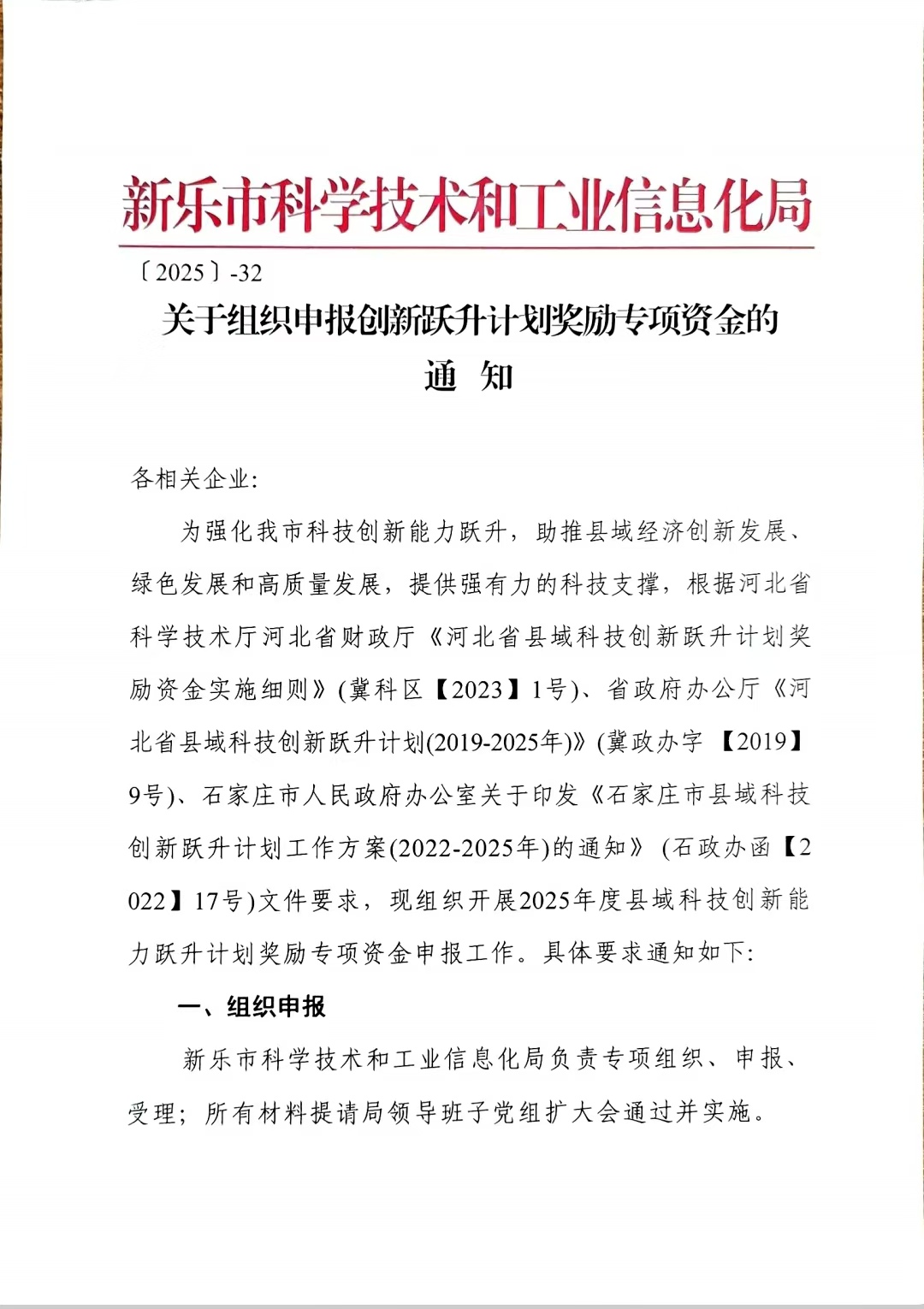 新乐市科学技术和工业信息化局关于组织申报创新跃升计划奖励专项资金的通知