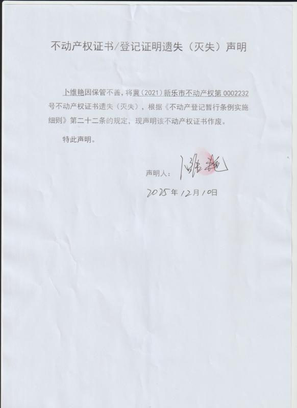 不动产权证书/登记证明遗失声明(20210002232)