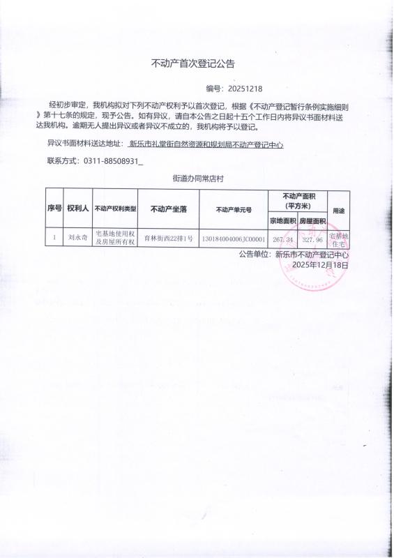 不动产首次登记公告(同常店村1宗)