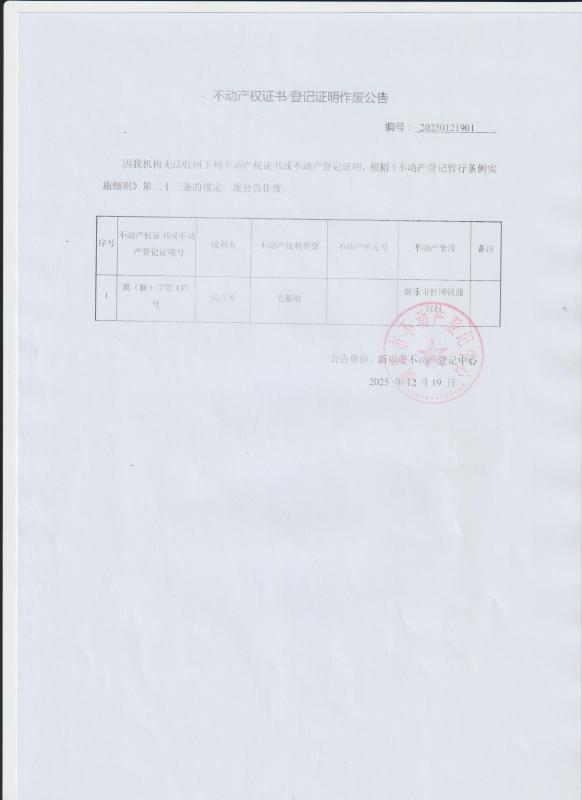 不动产权证书/登记证明作废公告(冀新字第137号)
