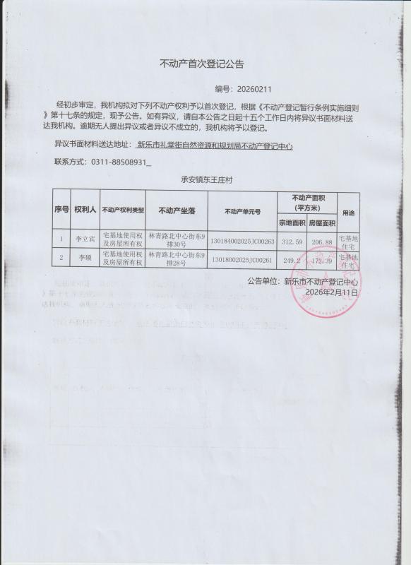 不动产首次登记公告(东王庄村2宗)