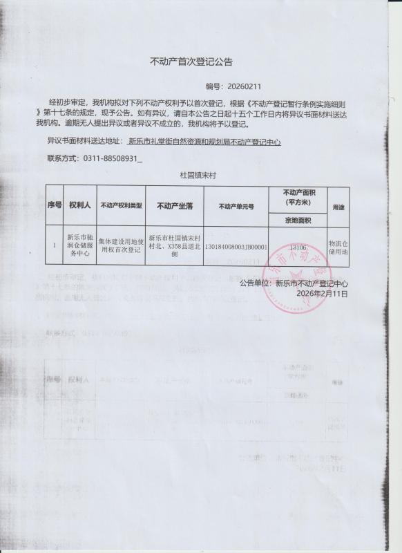 不动产首次登记公告(新乐市驰润仓储服务中心集体建设用地1宗)