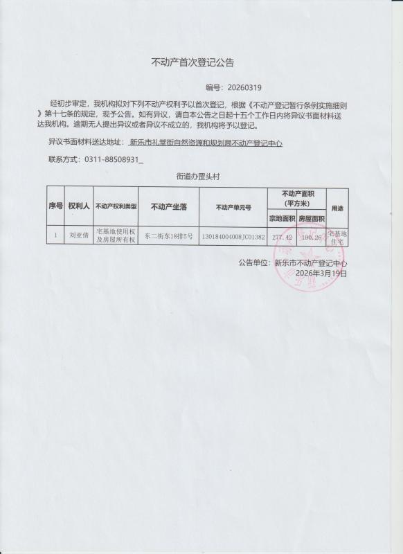 不动产首次登记公告(罡头村1宗)