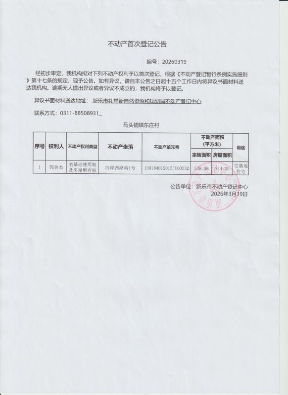 不动首次登记公告(东庄村1宗)