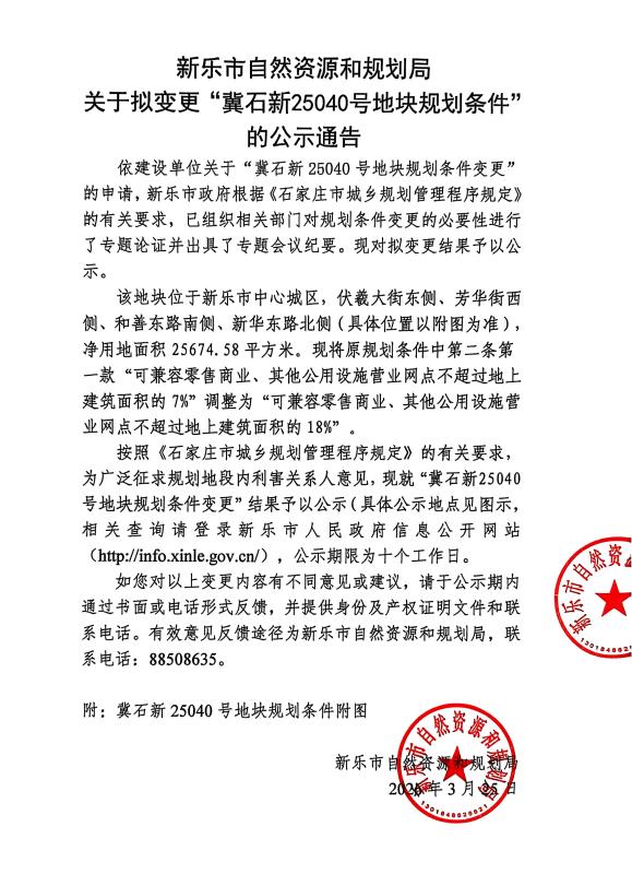新乐市自然资源和规划局关于拟变更“冀石新25040号地块规划条件”的公示通告