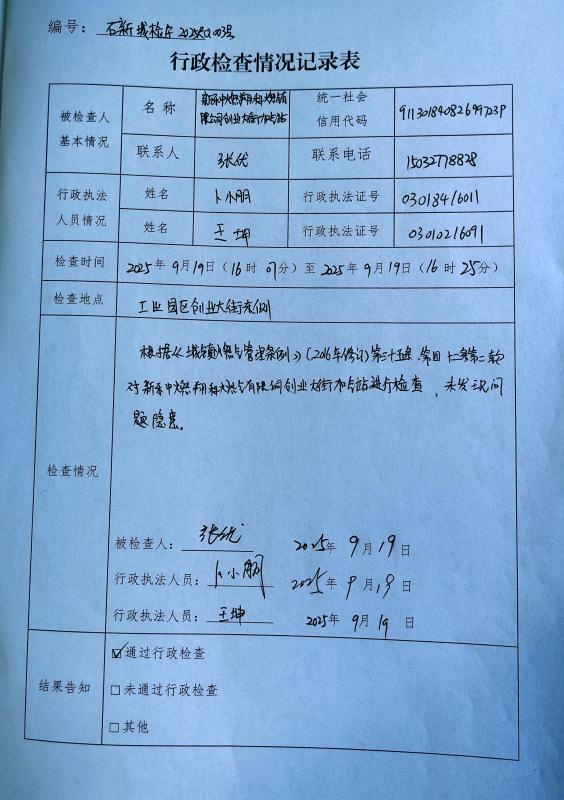 新乐市城市管理综合行政执法局行政检查结果公示(新乐中燃翔科燃气有限公司创业大街加气站)