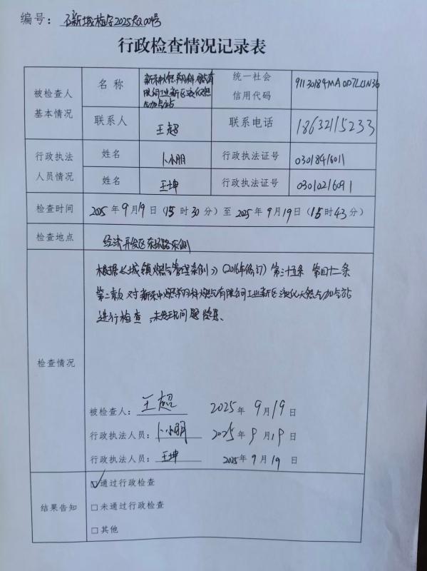 新乐市城市管理综合行政执法局行政检查结果公示(新乐中燃翔科燃气有限公司工业新区液化天然气加气站)