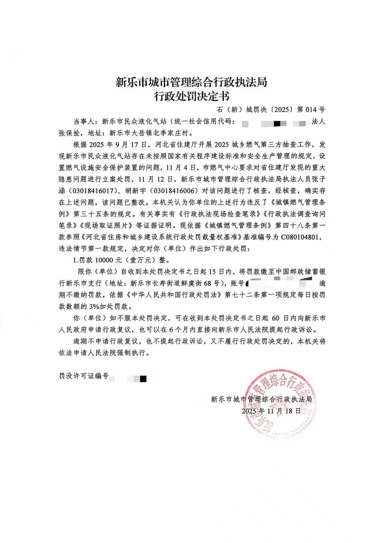 新乐市民众液化气站未按照规定设置燃气设施安全保护装置的问题处罚决定书-014号