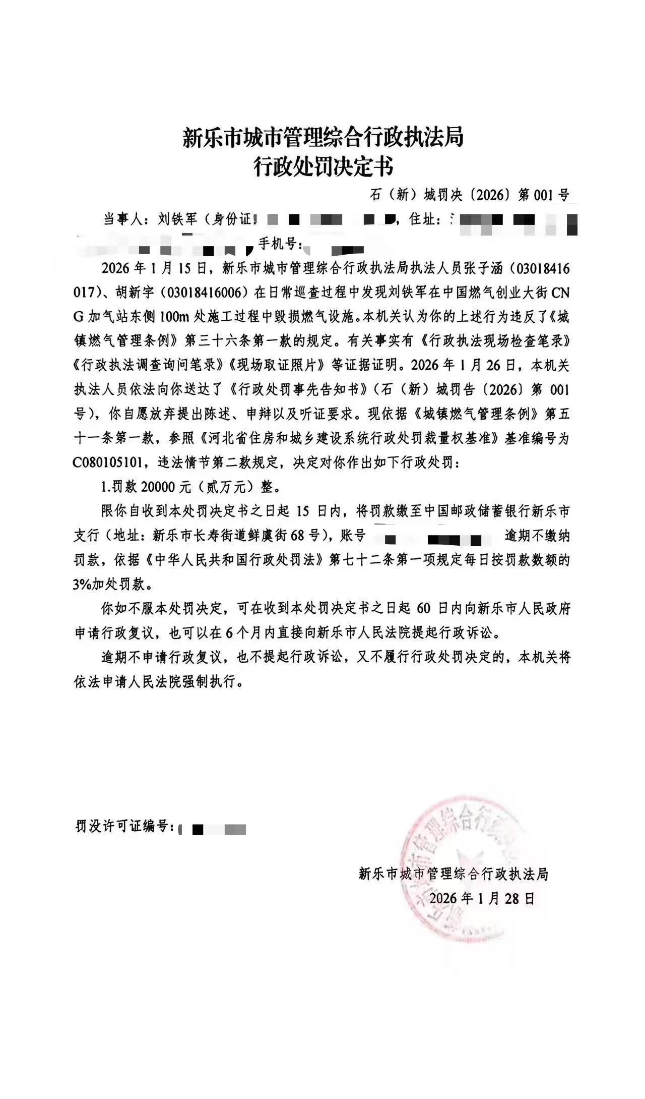 刘铁军在施工过程中毁损燃气设施处罚决定书-001号