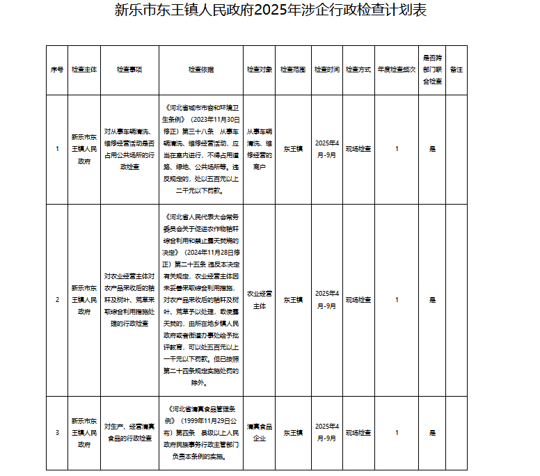 附表:新乐市东王镇人民政府2025年涉企行政检查计划表